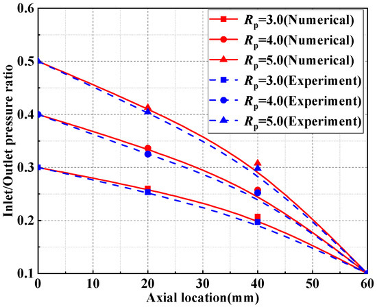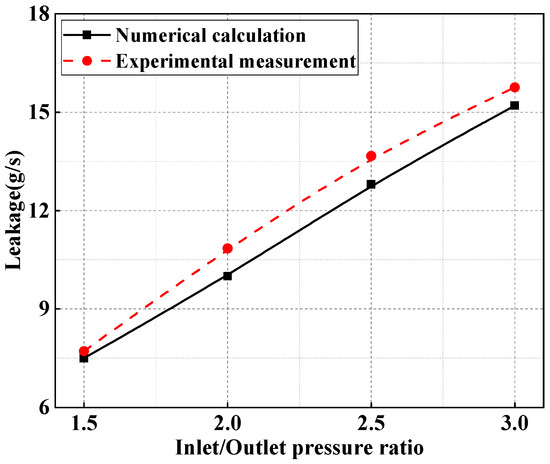 The numerical model of the same structure as the brush seal experimental piece was established by using the numerical simulation method in Section 3.1, Section 3.2 and Section 3.3. Then, the calculation results of the leakage characteristics and pressure drop distribution characteristics of the brush seal were compared with the experimental results, and the results are shown in Figure 10 and Figure 11. The maximum errors between the calculated values of leakage and pressure drop and experimental results were 7.4% and 5.8%, respectively. It shows that the numerical model can simulate the leakage characteristics and pressure drop distribution characteristics very well.