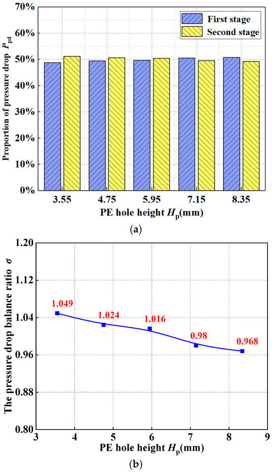 When the diameter of the hole is 0.4 mm, it can be seen in Figure 13a that the proportions of each stage pressure drop with five different PE hole heights were approximate, but the second-stage pressure drop decreases with the increase in the PE hole height. The effects of the PE hole height on the pressure drop balance ratio is shown in Figure 13b. The pressure drop balance ratio of the five kinds of PE hole heights were 1.049, 1.024, 1.016, 0.98 and 0.968, respectively. The pressure drop balance ratio gradually decreased as the PE hole height increased from 3.55 mm to 8.35 mm. In addition, when the PE hole height was 5.59 mm, the inter-stage pressure distribution was most even. Because when the PE hole height is low, the velocity of the air at the PE hole outlet is larger than that when the PE hole height is high, more air passes through the PE hole, and the volume flow increment of the second stage is larger. Therefore, the proportion of the second-stage pressure drop decreased with the increase in the PE hole height, and when the PE hole height was 5.59 mm, it was the best choice for the five structures.