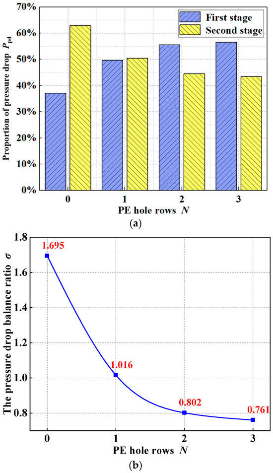 Effects of PE hole rows on pressure drop distribution between the two-stage brush seal: (a) proportion of pressure drop; (b) pressure drop balance ratio.