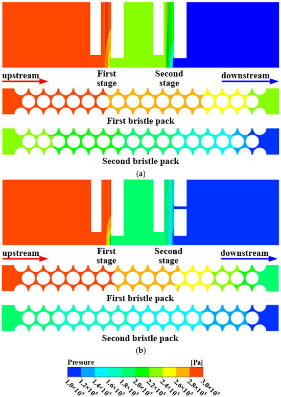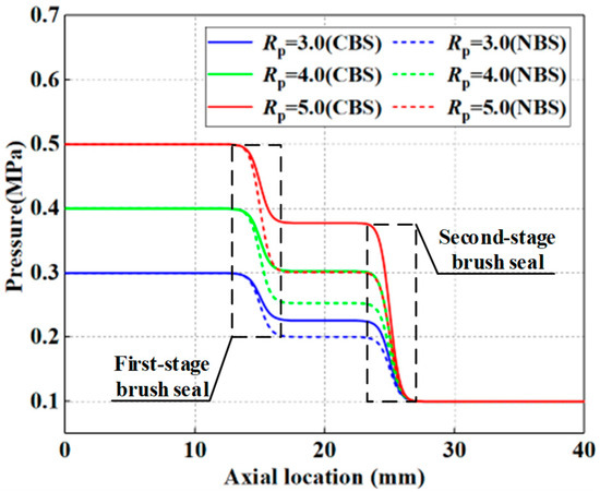 The axial pressure distribution of the CBS and NBS under the pressure ratio of 3 is shown in Figure 15. It can be seen in Figure 15 that when the air flowed from upstream to downstream, the pressure drop mainly occurred in the area of the bristle pack. The pressure of the first-stage last bristles of the NBS was obviously smaller than that of the CBS, which proved that the pressure distribution of the NBS was more even. This is because the passage area of the second-stage brush seal is increased compared to the CBS, which can reduce the pressure of second-stage, and balance the inter-stage pressure drop of the NBS.
