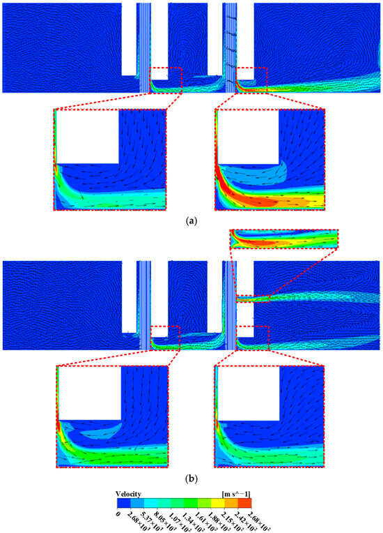 With a pressure ratio of 3, a PE hole diameter of 0.4 mm, a height of 5.95 mm and a number of rows of 1, the axial air velocity distribution of the CBS and NBS is shown in Figure 18. The air of two structures both formed jets near the backing plate, and the air of the NBS also formed a high-speed jet at the PE hole. The maximum air velocity of the CBS occurred near the second-stage backing plate, but the maximum air velocity of the NBS occurred at the PE hole, and the maximum flow velocity of the NBS is smaller than that of the CBS. Because the NBS increases the passage area of air, its maximum flow velocity is less than that of the CBS. However, since the PE hole diameter is less than the height of backing plate to rotor, the maximum velocity of the air occurs at the PE hole. Moreover, both structures generate vortex flow in the inter-stage chamber.