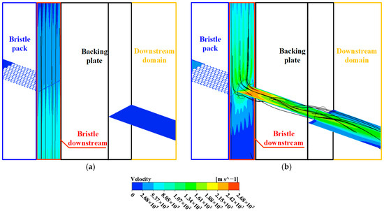 Based on the above working conditions and structure, the radial cross-section velocity downstream of the bristle pack is selected as shown in Figure 19. It can be observed that the axial and radial flow trends of the CBS and NBS brush seals are stronger, while the circumferential flow trend is weaker. The radial flow trend of the CBS on the downstream surface of the bristle pack is stronger than the axial flow trend, while the axial flow trend of the NBS around the PE hole and inside the bristle pack is stronger. Since the radial air preferentially flows into the PE hole, the radial flow trend of the air below the PE hole is weaker than that of the CBS.