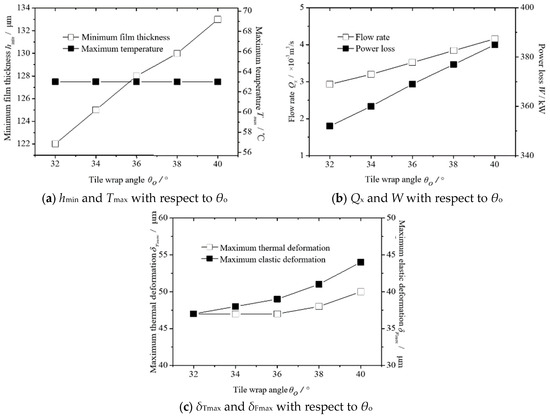 The thermo-elastic lubrication performance of the thrust bearing is calculated when the pad wrap angle θo is 32–40°. The calculation results are shown in Figure 6. Figure 6a shows the changes of hmin and Tmax at different θo values. It can be seen that hmin increases slightly with θo. When θo is 40°, hmin increases by 9% compared with that when θo is 32°, while Tmax does not change significantly with an increase in θo. Figure 6b shows the changes of Qx and W at different θo values. It can be seen that Qx and W increase monotonously with θo. When θo is 40°, Qx and W increase by 31% and 7%, respectively, compared with the case when θo is 32°. Figure 6c shows the changes of δTmax and δFmax at different θo values. With an increase in θo, δTmax and δFmax increase. When θo is 40°, δTmax and δFmax increase by 6% and 19%, respectively, compared with the case when θo is 32°. The value of θo influences the lubrication performance parameters Qx and δFmax of the thrust bearing. The comprehensive analysis shows that the value of θo is 32~36° is the best.