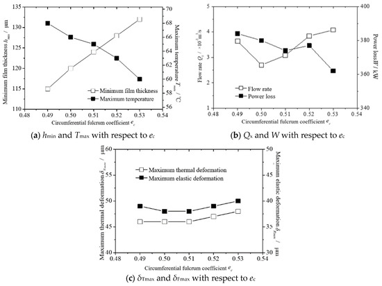 The thermoelastic lubrication performance of the thrust bearing is calculated when the circumferential fulcrum coefficient ec of the pad is 0.49~0.53. The calculation results are shown in Figure 7. Figure 7a shows the changes in hmin and Tmax at different ec values. It can be seen that hmin increases slightly with ec. When ec is 0.53, hmin increases by 15% compared with ec being 0.49, while Tmax decreases with an increase in ec. When ec is 0.53, Tmax decreases by 12% compared to when ec is 0.49. Figure 7b shows the changes in Qx and W at different ec. It can be seen that Qx decreases first and then increases with an increase in ec. The minimum value appears when ec is 0.53. The general trend of W decreases with an increase in ec. When ec is 0.53, W decreases by 6% compared to when ec is 0.49. Figure 7c shows the changes of δTmax and δFmax at different ec values. It can be seen that δTmax increases slightly with ec, while δFmax first decreases and then increases. The minimum value of δFmax appears when θo is 0.50 and 0.51, which are 38 μm. In summary, ec greatly influences hmin, Tmax, and Qx.