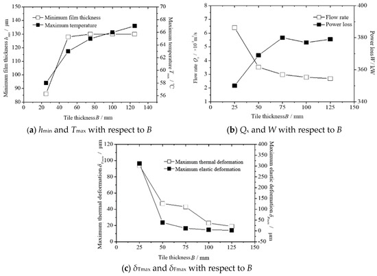 The hot bomb lubrication performance of the thrust bearing when the tile thickness B is 25–125 mm is calculated; the results are shown in Figure 8. Figure 8a shows hmin at different B and Tmax values. Parameters hmin and Tmax increase with B. When B reaches a certain value, hmin no longer changes. Parameters B and hmin change from 50 to 125 and 130, respectively. Parameter B is Tmax at 125 mm, and B is 25 mm, which is increased by 16%. Figure 8b Qx shows B and W. As B increases, Qx gradually decreases; B is Qx at 125 mm, B is 25 mm, down 58%, W increases with B, B is 125 mm, and B is 25 mm, up 8%. Figure 8c shows the value of δTmax at different B values; δTmax and δFmax decreased with increasing B, and B is the δTmax at 125 mm and δFmax 80% and 99% by 25 mm, respectively. The B value of the bearing tile is hmin, the total tile flow rate is Qx, the maximum thermal deformation amount is δTmax, and the maximum elastic deformation amount is δFmax. The influence becomes obvious, and the bearing performance is better when the B value exceeds 50 mm.