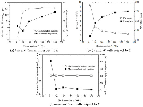 The thermal elastic lubrication performance of the thrust bearing with a different elastic modulus of the tile E is calculated. The value of E is 10–300 GPa. The calculation results are shown in Figure 9. Figure 9a represents hmin at different E and Tmax values. Parameter hmin increases with E. When E reaches a certain value, it remains constant. In contrast, the value of Tmax decreases as E increases. E is 50 GPa at the maximum level of Tmax. A minimum Tmax value of 60 °C is observed at E 300 GPa, i.e., an increase of only 5%. Figure 9b shows Qx with respect to E and W. As E increases, Qx gradually decreases. Parameter E is 300 GPa, and B decreases by 21% at 10 GPa, while W increases E by 300 GPa, i.e., by 8%. Figure 9c represents δTmax at different E and δFmax values. Parameter δTmax increases with E but remains unchanged at around 46.8 μm. In contrast, δFmax decreases as E increases; E reaches a certain value of δFmax. Parameter E becomes equal with δFmax at 300 GPa, i.e., about 780 μm less than when E is 10 GPa. Therefore, the influence is more obvious for the E value on the total tile flow being Qx and the maximum elastic deformation being δFmax. The value of E higher than 100 GPa is optimal.
