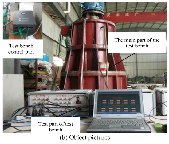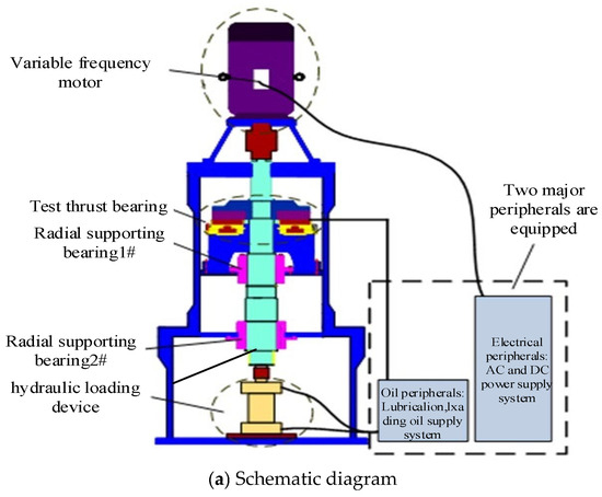 The test thrust bearing is manufactured according to the design parameters of the better bearing pad obtained from the previous calculation. The size of the test bearing is half of the actual design bearing size, and the size parameters of the bearing are shown in Table 3. The test is carried out on the vertical thrust-bearing test bench, which is designed and modified. The structural diagram of the test bench is shown in Figure 10. The thrust-bearing test bench comprises five parts: the main body, drive system, loading system, lubrication system, and test system. The rotor uses a stainless steel 1Cr18Ni9Ti thrust disc and stainless steel 2Cr13. The test bench is mainly divided into five parts: the main body of the test bench, the frequency conversion motor drive system, the loading device, the high-pressure oil station, and the lubrication and cooling system. The static pressure loading method is adopted. In order to cooperate with the low-speed start–stop test, the original high-speed low-torque motor is replaced with a high-torque frequency conversion speed regulation motor with a rated speed of 1000 r/min to ensure the starting torque. The size of the radial bearing shaft diameter is 156 mm, and the radial support bearing is a four-pad tilting pad bearing. The outer diameter of the thrust disc is 600 mm. Due to the reduction in the size, considering that the linear speed is the same as the actual size of the bearing, the maximum speed of the test motor is 3600 r/min. The maximum axial load of the hydraulic loading system is 10 tons. This test is the take-off speed test, and the speed of the test is 0~250 r/min.