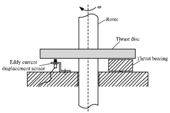 The eddy current sensor measures the displacement of the thrust disc relative to the bearing pad. Figure 11 shows the arrangement of the eddy current sensor. The sensor is arranged between two tiles and fixed on the thrust-bearing seat. The distance between the sensor’s end face and the thrust plate’s surface is 1.2 mm in a static state. When the rotor rotates, the thrust plate floats up due to the action of the liquid film. The sensor can measure the floating situation at the fulcrum.
