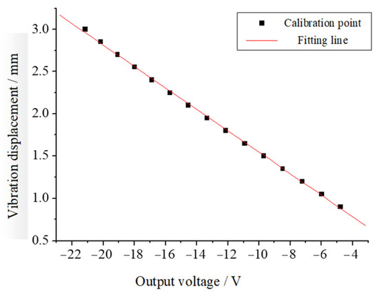 The test process is to divide the linear test range of the sensor into several segments on average, and test the nodes of each segment. It is considered that, at each node, the data measured by the spiral micrometer are the input value of the sensor, while the electrical signal measured by the eddy current sensor is the output value. The calibration curve of the sensor can be obtained by fitting the input and output values of the sensor by the least square method. The fitted static calibration line equation and the linear midpoint of the sensor are shown in Table 4. The x in the fitted curve equation represents the displacement, and U represents the output voltage value of the sensor. The calibration curve is shown in Figure 13.