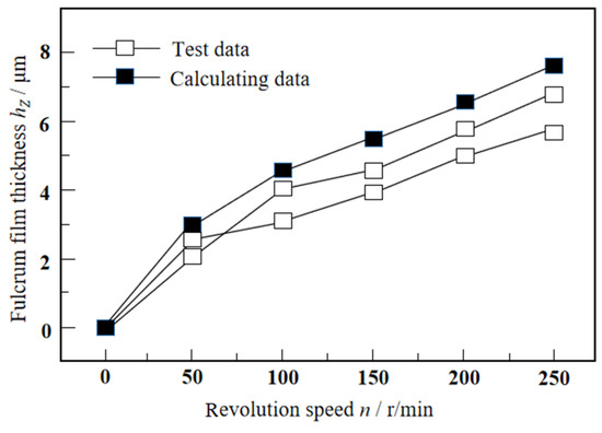 The test results are shown in Figure 14. The test represents a gradual acceleration process. The team’s film thickness of the bearing fulcrum at different speeds was tested. The test was repeated twice and compared with the theoretical calculation results. According to Figure 14, the thickness of the lubricating film of the thrust bearing increases gradually with the rotational speed. The theoretical calculation film thickness is slightly larger than the film thickness measured by the test. The reason may be that the bearing and the sensor had installation errors during the test. The error between the take-off speed (n = 180 r/min) measured in the test and the theoretical calculation result (n = 216 r/min) is 20%, which may be related to the roughness of the thrust disc and the bearing bush used in the test. On the other hand, the value of safety margin S will also affect the error between the two. The theoretical calculation and experimental results of this paper are compared with the research results in reference [23]. In reference [23], the theoretical and experimental research on the take-off speed of the thrust bearing is carried out. The size and working condition parameters of the bearing are similar to those in this paper. Reference [23] gives the theoretical calculation of the film thickness when the thrust-bearing fulcrum is at a speed of 0~300 r/min and the test result is between 0~5.5 μm. In this paper, when the rotational speed is 0~250 r/min, the thickness of the lubricating film at the bearing fulcrum obtained by theoretical calculation and the experimental result ranges from 0~7.5 μm. The comparison with reference [23] shows that the theoretical calculation and test data in this paper are reasonable.