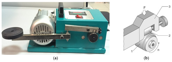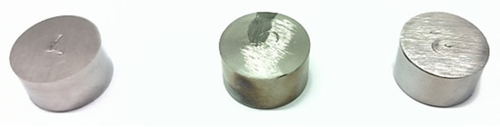 The specimens were tested for three minutes; the pressing force to the counterbody was F = 150 N, and the linear sliding speed was 1 m/s. Each specimen underwent three wear resistance tests. The mass of each specimen before and after the experiment was determined on an A&D HR-150AZ, Tokyo, Japan analytical balance with a resolution of 0.0001 g.