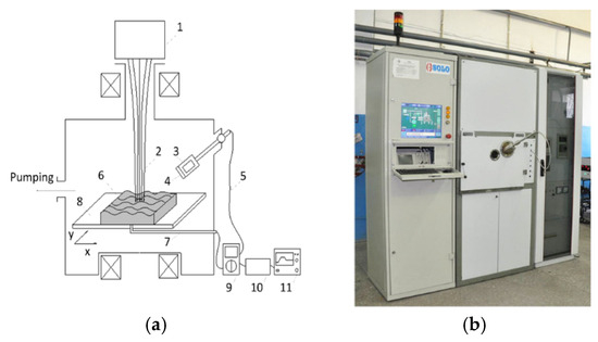Processing scheme (a) and appearance (b) of the SOLO facility: 1—plasma electron source; 2—electron beam; 3—objective; 4—quartz glass; 5—fiber optic cable; 6—specimen; 7—thermocouple; 8—manipulator table; 9—multimeter; 10—high-speed infrared pyrometer; 11—oscilloscope.