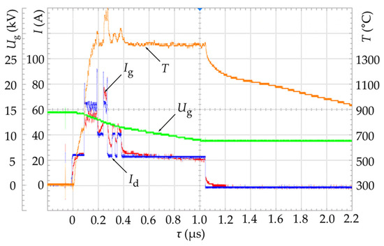 Oscillograms of the plasma cathode discharge current: Id—of the plasma cathode discharge current; Ig—current in the accelerating gap; Ug—accelerating voltage [kV]; T—high-speed pyrometer output signal [°C].