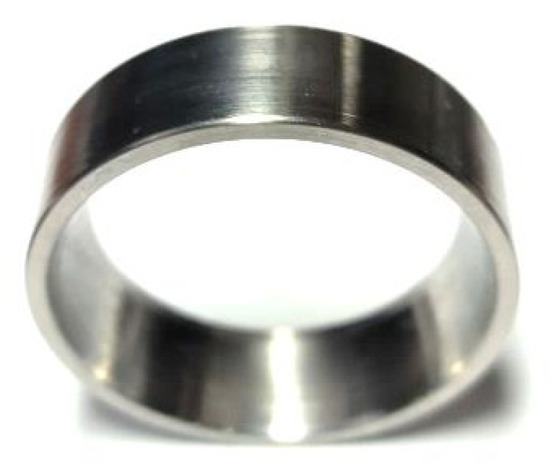 Subsequently, the specimens underwent testing on a friction machine (Figure 4a) to evaluate their resistance to surface wear under EBP conditions. Wear resistance was assessed using a “crossed cylinders” configuration (Figure 4b). A rotating counterbody made from VT-6 titanium alloy with an outer diameter of 40 mm, a width of 11 mm, and a hardness of 30 ± 2 HRC was used (Figure 5). This counterbody was manufactured on a DMG NEF 400 turning center and finished to a surface roughness of Ra 1.8 μm. The hardness of the test specimens was 15 ± 1 HRC for the VT-1 alloy and 30 ± 2 HRC for the VT-6 alloy, respectively.