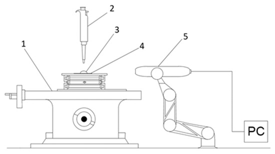 The scheme of the contact angle measurement setup, where 1 is the 3-axis positioning stage, 2 is the adjustable-volume laboratory pipette, 3 is a distilled water droplet, 4 is the test specimen, and 5 is an optical microscope.