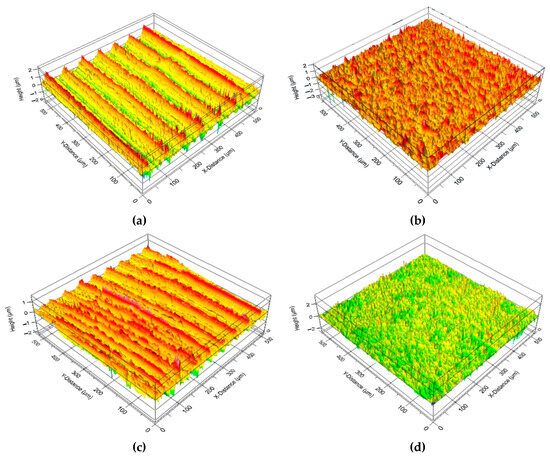 Three-dimensional surface topographies of specimens: (a) VT-1 after turning; (b) VT-1 after EBP; (c) VT-6 after turning; (d) VT-6 after EBP.