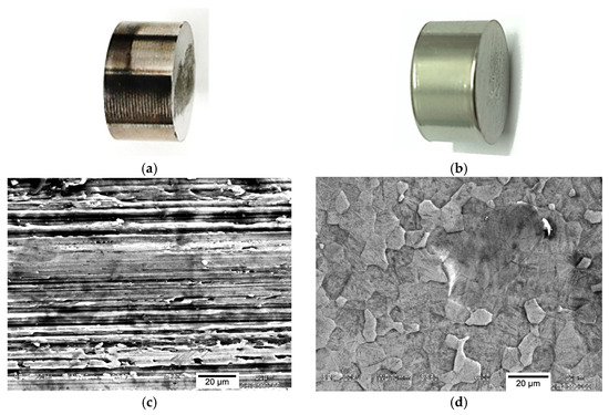 EBP is accompanied by melting and microroughness evaporation and the movement of the melt under the action of surface tension forces filling the pores. Macro images are provided to assess the surface quality in Figure 10. These macrophotographs and images of the specimen surface obtained using SEM after turning (Figure 10a,c) and after EBP (Figure 10b,d) revealed no traces of mechanical processing on the specimen subjected to EBP. The surface was smooth and uniform on the macrophotograph, and the SEM image revealed a granular microstructure with a grain dimension of about 10 μm.