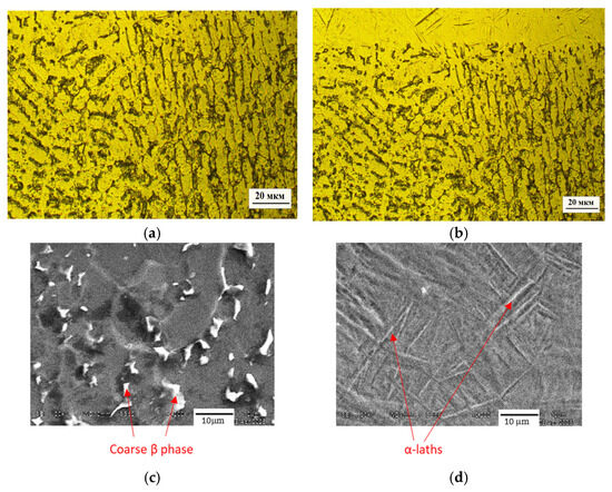 The microstructure of the VT-6 alloy specimen: optical microscopy (a) before and (b) after EBP; SEM (c) base metal and (d) modified zone.