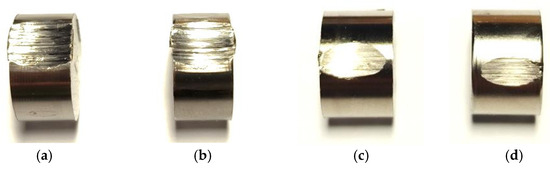 Titanium alloy specimens after wear resistance testing: (a) VT-1 before EBP; (b) VT-1 after EBP; (c) VT-6 before EBP; (d) VT-6 after EBP.