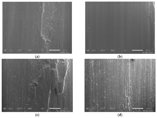 SEM images of wear surfaces on titanium alloys: (a) VT- before EBP; (b) VT-1 after EBP; (c) VT-6 before EBP; (d) VT-6 after EBP.