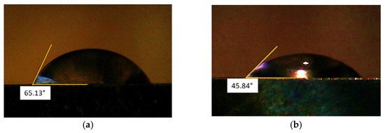 Titanium materials used in biomedicine must provide a set of properties, including hydrophilicity, which contributes to the faster integration of the material with the tissues of a living organism. The contact angle of a water drop on a flat surface determines the hydrophilicity or wettability of a surface. It was reported that the non-treated Ti-6Al-4V alloy contact angle is in the range of 64 to 92.8° [43,44]. Figure 16 shows the contact angles of wetting for the specimens made from VT-6 alloy after mechanical treatment and EBP. The measurement shows that the EBP decreases the contact angle of wetting from ~65° to ~46°, which indicates an increase in the hydrophilicity compared to the original surface. Thus, EBP can be a finishing polishing process to reduce roughness and create special properties of working surfaces. The contact angle reduction increases cell attachment and facilitates titanium implant integration into the body.