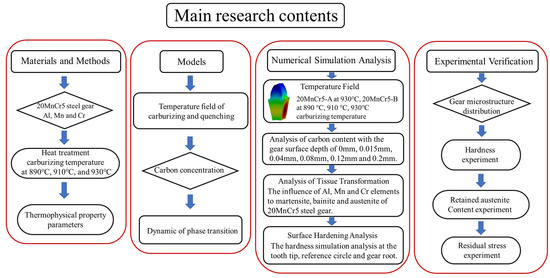 However, the research on microstructure prediction, grain size control and residual stress change of 20MnCr5 steel FZG gear with increased Al, Mn and Cr element proportions in different heat treatment processes still needs further improvement. By increasing the proportions of Al, Mn and Cr elements in 20MnCr5 steel, this paper established a multi-field coupling model of 20MnCr5 steel FZG gear carburizing process by using COSMAP software (15. 0. 1) version [31,32,33,34,35], analyzed the influence mechanism of different carburizing temperature and 200 °C tempering on the surface microstructure, martensite and retained austenite volume, hardness and residual stress at different depths, and carried out relevant experimental verification. The research process diagram is shown in Figure 1.