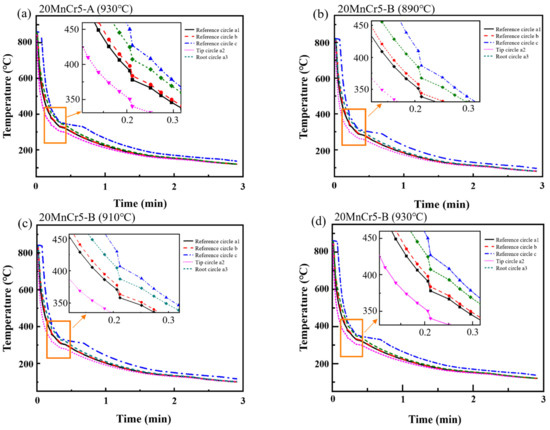 Temperature–time curves of quenching process of gears; (a) 20MnCr5-A steel gear carburizing at 930 °C and quenching; (b–d) 20MnCr5-B steel gear carburizing at 890 °C, 910 °C and 930 °C, and quenching.
