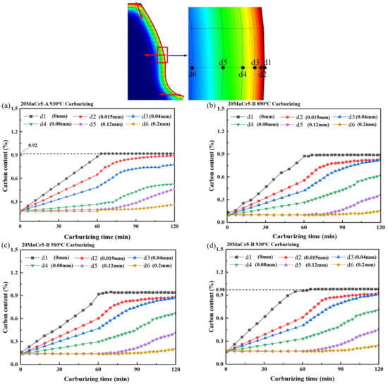 Carbon content–time curve at different positions of gears; (a) carbon content changes of 20MnCr5-A steel gear carburizing at 930 °C; (b–d) carbon content changes of 20MnCr5-B steel gear carburizing at 890 °C, 910 °C and 930 °C.
