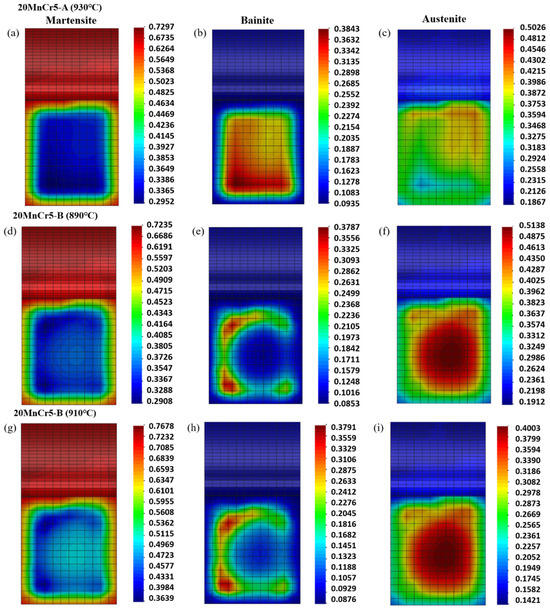 Figure 11 shows the distribution of martensite, bainite and austenite of the 20MnCr5 steel gear after heat treatment. From Figure 11a,d,g,j, according to Equations (10) and (11) in Section 3.3, more martensitic structures are generated on the gear surface after quenching, and the martensitic volume gradually decreases from the gear surface to the gear core. As shown in Figure 11, compared with the 20MnCr5-A steel gear after carburizing at 930 °C, the 20MnCr5-B steel gear has the martensite content on the surface and in the core increased from 72.97% and 29.52% to 82.15% and 41.35%, respectively, and the austenite content on the surface and in the core decreased from 18.67% and 50.26% to 7.72% and 32.31%, respectively, after carburizing at 930 °C. It indicates that increasing the content of Al to 0.032% is beneficial to greatly reduce the retained austenite volume. From Figure 11d–l, with the carburizing temperature increasing, the martensite volume on the 20MnCr5-B steel gear surface also increases, while the volume of retained austenite gradually decreases. The 20MnCr5-B steel gear has the largest martensite volume fraction at 930 °C, 82.15% at the tooth tip, 79.91% at the reference circle and 76.67% at the gear root. This is because the temperature at the tooth tip drops faster than that at the tooth surface and root during quenching. Due to the high carbon content on the gear surface, the initial temperature of martensitic transformation decreases after quenching, resulting in the retained austenite. The bainite is less affected by carburizing temperature, but its microstructure changes with the carburizing temperature and Al content. And more Mn and Cr elements will reduce the driving force of bainite nucleation.