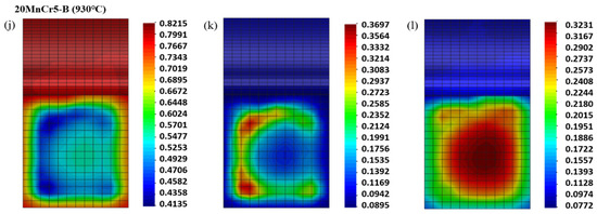 Distribution of martensite, bainite and austenite after carburizing and quenching of the gear; (a–c) martensite, bainite and austenite of 20MnCr5-A steel gear after carburizing at 930 °C; (d–f) martensite, bainite and austenite of 20MnCr5-B steel gear after carburizing at 890 °C; (g–i) martensite, bainite and austenite of 20MnCr5-B steel gear after carburizing at 910 °C; (j–l) martensite, bainite and austenite of 20MnCr5-B steel gear after carburizing at 930 °C.