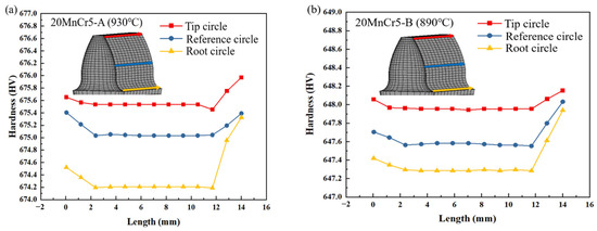 The hardness simulation results at the tooth tip, reference circle and gear root are shown in Figure 12. The tooth tip more easily reaches the carburizing temperature, and the quenching temperature is reduced faster. As a result, more carbon atoms will penetrate into the tooth tip, and the carburized layer at the tooth tip is deeper. The faster quenching cooling rate will promote more austenite to transform to martensite, so the tooth tip is harder. The farther the tooth tip, reference circle and root are from the gear face, the lower the hardness. Due to the high carbon potential sources in multiple directions, the closer to the gear face, the harder it is. The surface hardness of the 20MnCr5-A and 20MnCr5-B steel gears decreases gradually along the direction of the tooth tip, reference circle and gear root. When the 20MnCr5-A steel gear is carburized at 930 °C, the tooth surface is in the hardness range of 674.20~676.03 HV. When the 20MnCr5-B steel gear is carburized at 890 °C, 910 °C and 930 °C, the tooth surface is in the hardness range of 647.28~648.17 HV, 651.26~652.18 HV and 683.27~684.15 HV, and the hardness is mainly related to the martensite volume on the gear surface and the carbon content in the structure [43]. The hardness of the 20MnCr5-B steel gear changes little, showing the high consistency, and indicating that the increase in Al content to 0.032% can improve the uniformity of the surface of carburized and quenched 20MnCr5 steel.