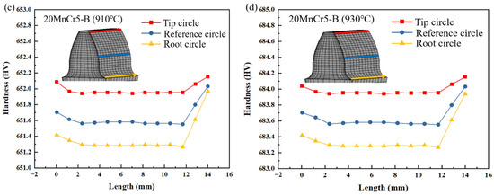 Surface hardness distribution after carburizing–quenching; (a) the surface hardness of 20MnCr5-A steel gear after carburizing at 930 °C; (b–d) the surface hardness of 20MnCr5-B steel gear after carburizing at 890 °C, 910 °C and 930 °C.