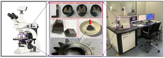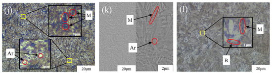Figure 14a–l show the tooth tip, reference circle and gear core microstructure at the microscale of 100 µm and 10 µm. From Figure 14a–c, the 20MnCr5-A steel gear shows traces of carbon potential diffusion from the surface to the gear core of the gear at the microscale of 100 μm after carburizing at 930 °C. At the microscale of 10 μm, there are more acicular and massive martensite and massive retained austenite on the gear tooth tip and reference circle. At the gear core, there are mainly a mixture of martensite, bainite and austenite, and massive retained austenite.
