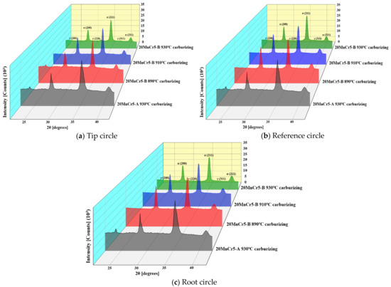 The retained austenite at the tooth tip, reference circle and root of the 20MnCr5-A steel gear is shown in Figure 17. The martensite is composed of α (200) and α (211) crystal plane diffraction lines, and the retained austenite is composed of γ (200), γ (220) and γ (311) crystal plane diffraction lines. Scan 5 diffracted rays step by step to determine the corresponding diffraction angle 2θ. During the quenching, the temperature at the tooth tip drops faster, and the retained austenite content is less than that at the reference circle and root closer to the tooth core. As shown in Table 3, the volume of retained austenite of the 20MnCr5-A steel gear surface is 18.2~19.4% when carburized at 930 °C. The retained austenite volume on the 20MnCr5-B steel gear surface gradually decreases with the increase of temperature. At 890 °C, 910 °C and 930 °C, the retained austenite volume is 20.0~20.7%, 14.9~16.2% and 7.5~8.3%, respectively. By comparison with Figure 11, the actual measurement of the retained austenite volume at the tip circle, reference circle and root circle shows that the error with the numerical simulation is less than 5%. Increasing the Al, Mn and Cr elements can significantly reduce the austenite phase region and regulate the retained austenite.