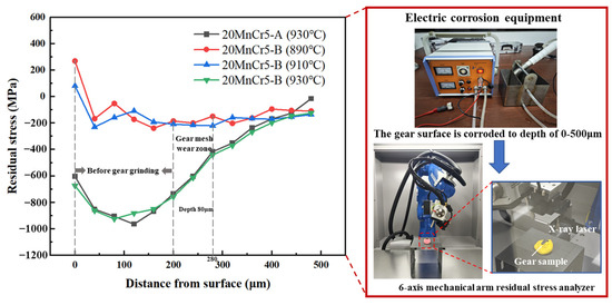 The 20MnCr5 steel gear surface is electrochemically corroded by supersaturated sodium chloride solution. The residual stress analyzer of the 6-axis mechanical arm is used to test the residual stress at depths of 0~500 μm. The residual stress test results of the gear surface at different depths are shown in Figure 18.