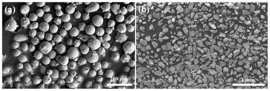 SEM morphologies of different powders. (a) CoCrFeNiMn; (b) TiC.