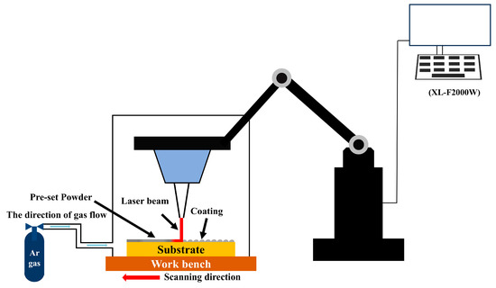 Processing was carried out using the XL-F2000W fiber continuous laser processing system, which is manufactured by Shenzhen Han’s Photonics Technology Co., Ltd., Shenzhen, China. The processing parameters were arranged as follows: laser power of 1200 W, defocusing amount of +5 mm, scanning speed of 700 mm/min, cladding length of 40 mm, 12 passes, 1.2 mm interval between each pass, and Ar shielding gas. The gas was first ventilated for 20 min and then kept flowing until the end of the experiment. The schematic diagram of the laser processing system is shown in Figure 2. Table 2 illustrates the naming method of samples.