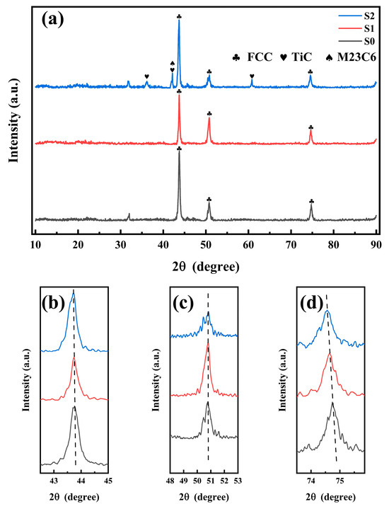 Figure 3a shows the phase constitutions of the S0, S1, and S2 coatings. One can see that the pure CoCrFeNiMn HEA without the addition of TiC is composed of a single FCC phase. As we know, the basic phase of CoCrFeNiMn HEA is FCC [21,22,23]. After adding TiC, the main peak of the coating is composed of the FCC phase, indicating that the addition of TiC does not cause a phase change in the main peak of the CoCrFeNiMn coating. First, one can observe the S1 sample. After adding 10% TiC, no new peaks appear in the coating. The main reason may be that the amount of additional TiC is too small [24]. The denser TiC moves to the bottom due to the influence of gravity, and thus there is less TiC at the top. In addition, the small amount of TiC may decompose due to the action of the laser, so there is less TiC in the coating, resulting in no obvious change in the XRD pattern. When the amount of additional TiC reaches 20%, the TiC and the M23C6 begin to appear. This indicates that part of the TiC remains unmelted in the coating. Part of the TiC melts and decomposes, and the decomposed C atoms form metal carbides. The M23C6 phase has a relatively high hardness. When it is dispersed in the alloy in the form of fine particles, it can play a role of dispersion strengthening, hindering the movement of dislocations, thus improving the hardness and strength of the alloy.