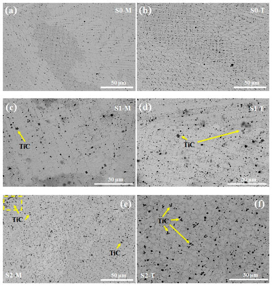 Figure 4 demonstrates the morphology of the samples, where all morphological transitions in different regions can be observed. The cooling rate of LC is very large. According to the constitutional supercooling criterion [29,30], the temperature gradient (G) and the solidification rate (R) have an important influence on the crystal growth of the coating. In the micro-molten pool, planar grains are formed, and simultaneously, cellular grains are formed in the middle part of the HEA coating. These laterally grown grains weaken the heat diffusion, thus reducing the G/R ratio. With the consumption of the heat, the surface layer of the molten pool begins to solidify, and the original grains become unstable and are turned into small columnar crystals, which is clearly shown in Figure 4a. Finally, the coating enters the solidification stage, and argon cooling on the surface is involved, which accelerates the solidification speed of the molten pool. The latent heat of crystallization of the liquid metal can be obtained from both the lower substrate and the upper cold argon, resulting in the smallest G/R ratio. The crystals are formed without directionality and become more fragmented, and the crystal size is smaller, which is clearly shown in Figure 4b. It is worth noting that there is only a small amount of TiC present in the middle and top regions of the coating with 10% TiC addition, as shown in Figure 4c,d. This also explains why no TiC phase was found in the XRD results. After the TiC addition amount reaches 20%, there are more slightly melted TiC particles in the top and middle regions of the coating, as seen in Figure 4e,f. The presence of more TiC hard phases in the top and middle regions of the S2 coating will improve the wear resistance of the coating.