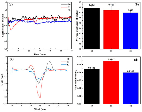 (a) COF; (b) average COF; (c) two-dimensional wear patterns; (d) wear volume.