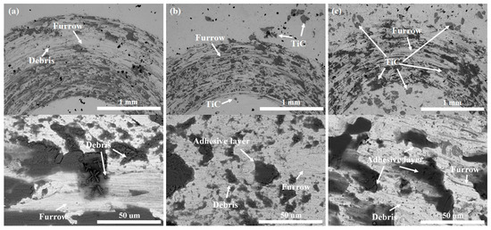 Figure 6 shows the SEM images of the wear tracks of the worn samples S0, S1, and S2. The low-magnification images on the top allow us to observe the complete wear profiles, while the images below are locally magnified high-magnification ones, enabling us to clearly see the details of the wear. These samples exhibit both abrasive wear and adhesive wear. As can be seen from Figure 6a, the wear of sample S0 is extremely severe, with deep furrows existing and some wear debris emerging simultaneously. In terms of the nature of the wear, this can be attributed to abrasive wear. The furrows of S1 and S2 are much shallower, and an adhesive layer appears at the same time, indicating that the addition of TiC can reduce abrasive wear while adhesive wear occurs. In addition, after adding TiC particles, the wear profiles of the coatings are significantly narrowed, as shown in Figure 6b,c. Among them, the wear profile of sample S2 is the narrowest and shallowest, and the delamination of the adhesive layer is quite obvious. This is consistent with the result shown in Figure 6c. It is worth noting that there is no TiC present in the wear profile of sample S1, which indicates that during the wear process, TiC is detached due to wear, aggravating the wear situation. However, TiC is distributed within the wear profile of sample S2, which reduces the stress concentration and enhances the wear properties of the coating. This is in line with the above analysis.