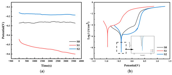 An OCP test for 3600 s was carried out on the samples that had been immersed in a 3.5% NaCl solution for 3 h to determine whether the samples formed a stable passivation film. Figure 7a presents the open-circuit potential curves of all the coatings. It can be observed that the open-circuit potential curves of the S0 and S2 coatings remained stable from the initial stage, which means that after 3 h of immersion treatment, one can successfully obtain stable passivation films. In contrast, the open-circuit potential curve of the S1 coating continued to decline. This indicates that samples S0 and S2 obtain more protective passivation films than sample S1. Among them, the test results of the open-circuit potential show that the S2 coating exhibits a higher open-circuit voltage, indicating its better steady-state response characteristics and stronger passivation tendency. It is capable of producing a passivation film that is more protective and stable, which effectively decreases the susceptibility to corrosion and decelerates the rate of the corrosion reaction [32,33]. In the 10 wt% TiC coating (S1), due to gravitational sedimentation and laser decomposition, the reinforcing phases, such as TiC, are unevenly distributed. This uneven distribution will lead to differences in composition and structure at different parts of the coating surface. As a result, in a corrosive environment, the reaction activities of various parts of the coating surface are different, making it easy to form local corrosion cells, accelerating the corrosion process, and further affecting the formation and stability of the passive film, thus resulting in poor passivation behavior.