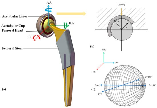 (a) Hip joint model schematic; (b) model cross-sectional view; (c) spherical coordinate of femoral head.