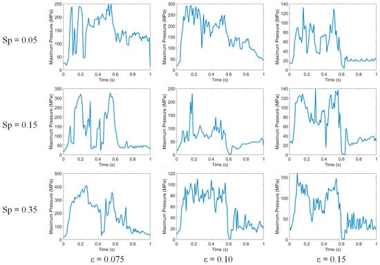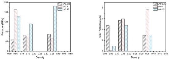 The motion speed and loading generated during the swing phase of the hip joint in a standard gait cycle change the film thickness and load-carrying capacity on the fluid film surface. The results of the film thickness and load-carrying capacity per gait cycle under different texture density and aspect ratio parameters of the hip joint are shown in Figure 6, in which the pressure represents the maximum value of the load-carrying capacity on the fluid film surface within the cycle. Combining the load change in Figure 2 and the pressure change in Figure 6, it is found that the trend of the fluid film pressure is mainly affected by the axial load applied to the hip joint, and when , it significantly affects the amplitude of the oil film pressure. When the load experiences the change from the peak to the trough and then to the peak, the overall trend of the oil film pressure also changes. When the movement of the hip joint transitions from the swing phase to the stance phase, as the axial load decreases to around 300 N, the fluid film pressure also decreases accordingly to a stable range. The average load-carrying capacity of the fluid film is obtained by calculating the mean of all pressure values and film thicknesses within the calculation cycle in Figure 7.