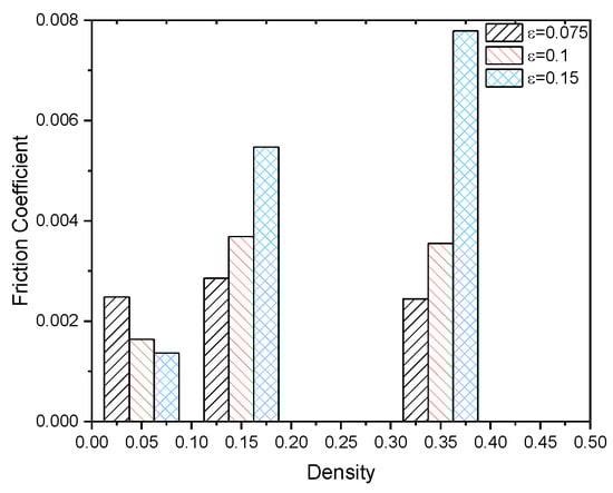 By comparing nine design groups and one control group with different texture densities and texture aspect ratios in Table 2, the following conclusions can be drawn: The minimum film thickness on the surface of the hip joint is inversely proportional to the average pressure of the fluid film. A larger fluid film pressure indicates better lubrication performance. As the texture density increases from 0.05 to 0.35, the variation trend of the fluid film pressure first decreases and then increases, and as the texture aspect ratio increases from 0.075 to 0.15, the fluid film pressure gradually increases. The shear stress of the grid unit is calculated according to the Newtonian fluid shear stress formula, and the friction coefficients of different textured surfaces in Figure 8 are calculated based on the shear stress structure. Compared with the fluid film pressure and friction coefficient of the smooth surface of the hip joint in Table 2, the hip joint with a textured surface has a larger fluid film pressure and a smaller friction coefficient during the friction process, which indicates that the surface texture design can significantly improve the lubrication performance.