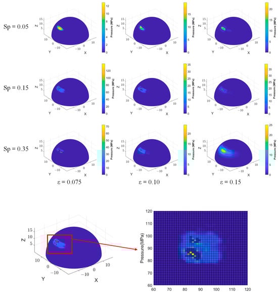 When comparing the surface fluid film pressure during the stance phase of gait in Figure 9, it was found that when , the fluid film pressure was relatively high and the friction coefficient was the smallest. The magnified view corresponds to . It can be seen that this area is the location with a relatively severe degree of wear, as reported. This combination has a higher oil film load-bearing capacity, thus exhibiting better lubrication and anti-friction effects. This indicates that when the texture functions as a micro hydrodynamic bearing, it is more capable of reducing friction. Excessively high texture density will, on the contrary, reduce the elastohydrodynamic lubrication effect and fail to effectively reduce friction.