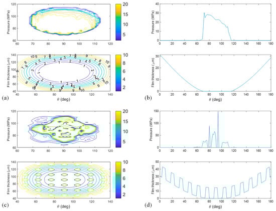 The pressure and film thickness contour: (a) smooth surface; (b) textured surface; (c) central sectional views of the smooth surface; (d) central sectional views of the texture surface.