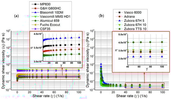 The viscosity trends for each cutting liquid over the range of shear rates are shown in Figure 3. For the cutting oils (Figure 3a), a nearly Newtonian behavior was observed, with no significant thinning or thickening effects. Among them, Vascomill MMS exhibited the highest average shear viscosity, followed by CSF 35. Alumicut 659 fell within the group with the lowest viscosity values, comparable to G600 HC, Blasomill 10DM and MP830. Fuchs Ecocut 3046 showed an intermediate viscosity value.