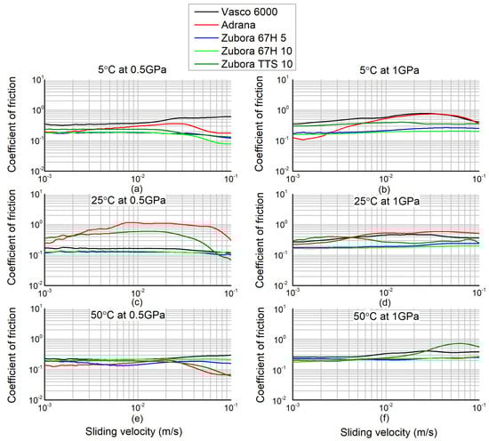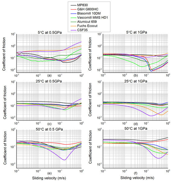 Frictional performance for cutting oils at 5 °C for a nominal Hertzian pressure of (a) 0.5 GPa and (b) 1 GPa, at 25 °C for (c) 0.5 GPa and (d) 1 GPa, and at 50 °C for (e) 0.5 GPa and (f) 1 GPa.