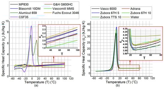 Specific heat capacity of the (a) cutting oils and (b) water-based cutting fluids.